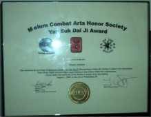 The award presented to Mr Anslow read: Molum Combat Arts Honour Society Yap Suk Dai Ji Award This is to certify that Stuart Anslow has obtained the privilege of Honourary Senior