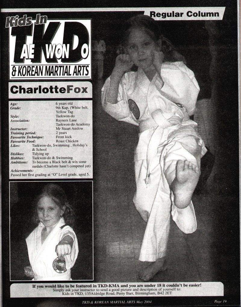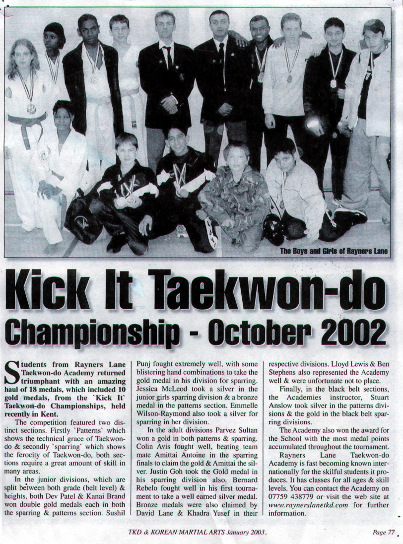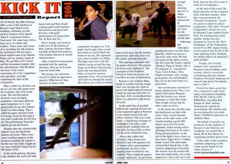 2004 Taekwon-do & Korean Martial Arts Magazine - December 2004 2nd England IAOMAS Seminar Harrow Observer, 4th November, 2004 Medal haul for Rayners Lane Fighters Harrow Times, 11th November, 2004 Academy has 7 world champs Taekwon-do & Korean Martial Arts Magazine - November 2004 Stuart Anslow Interviews Grandmaster Kong Young Il, 9th Degree Taekwon-do & Korean Martial Arts Magazine - November 2004 Stuart Anslow - Martial Moves Taekwon-do & Korean Martial Arts Magazine - September 2004 Dawn of the 1st South East Opens Taekwon-do & Korean Martial Arts Magazine - May 2004 Kids In TKD - Charlotte Fox Fighters Magazine - April 2004 Kick It 2004 Article by Dev Patel Taekwon-do & Korean Martial Arts Magazine - March 2004 Opposite Sides Of The World Meet Taekwon-do & Korean Martial Arts Magazine - February 2004 Patterns: Telling it like it is - The Sine Wave Taekwon-do & Korean Martial Arts Magazine - January 2004 1st England IAOMAS Seminar |