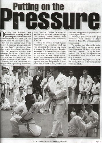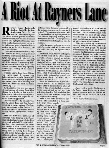 2001/2000 Taekwon-do & Korean Martial Arts Magazine - August 2001 Grappling For Kicks Article, 3 page article, written by the Academies Instructor Taekwon-do & Korean Martial Arts Magazine - August 2001 Taekwon-do Explosion 2001, 2 page report Taekwon-do & Korean Martial Arts Magazine - June 2001 A 6 page interview with the Academies Instructor, Mr Stuart Anslow III Taekwon-do & Korean Martial Arts Magazine - June 2001 1st Year Anniversary Demonstration Spectacular & Party full page report Fighters Magazine - May 2001 A 5 page interview with Stuart Anslow, Instructor of Rayners Lane Academy Taekwon-do & Korean Martial Arts Magazine - March 2001 Patterns: Are You Missing The Point, a 4 page article writen by the Academies Instructor Press Clips & others |
